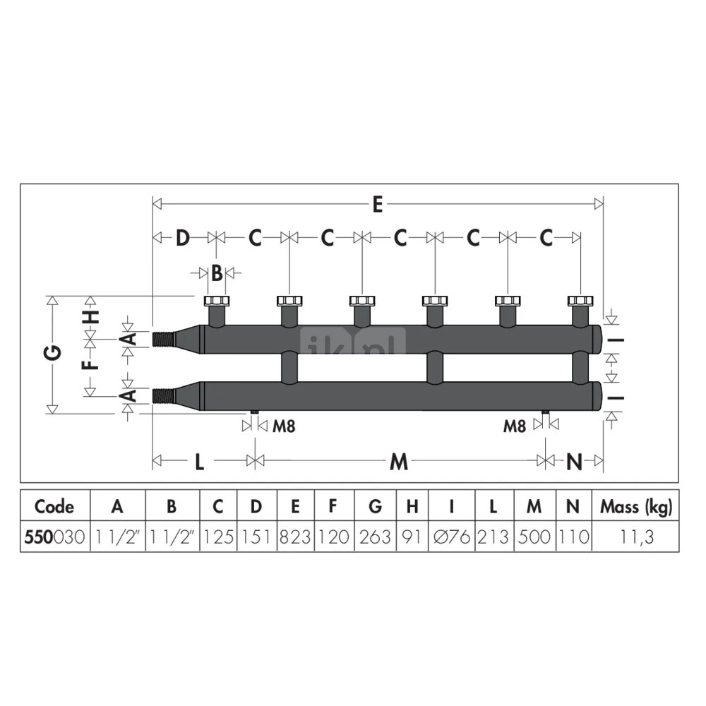 Rozdzielacz do instalacji grzewczych i chłodniczych. Wykonany ze stali.