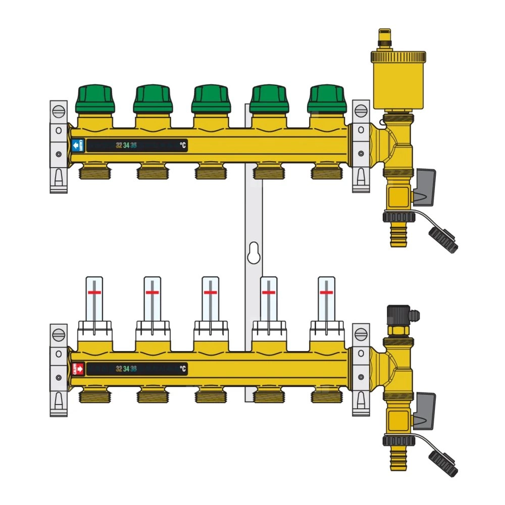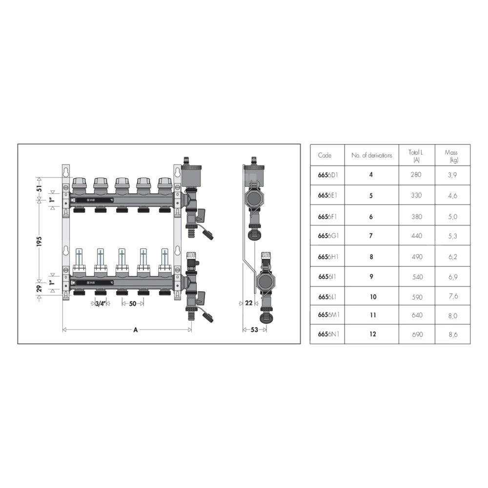 Zespół rozdzielaczy Zawiera: - rozdzielacz powrotny z wkładkami równoważącymi DYNAMICAL® przystosowanymi do współpracy z siłownikami elektrotermicznymi, zakres regulacji 25÷170 l/h; - rozdzielacz zasilania z przepływomierzami; - zakończenie rozdzielacza z automatycznym odpowietrznikiem z kapturkiem higroskopijnym i zaworem spustowym; - stalowe uchwyty montażowe do zastosowania w skrzynkach lub bezpośrednio na ścianie. główne podłączenie: G 1" (ISO 228-1) GW, Podłączenie do złączek Caleffi. przyłącza wylot: G 3/4" A (ISO 228-1) GZ, 11 wyjść. Maksymalne ciśnienie pracy: 6 bar. Zakres temperatury medium: 5–60 °C. Rozstaw wyjść: 50 mm. Zakres regulacji natężenia przepływu: 25–150 l/h.