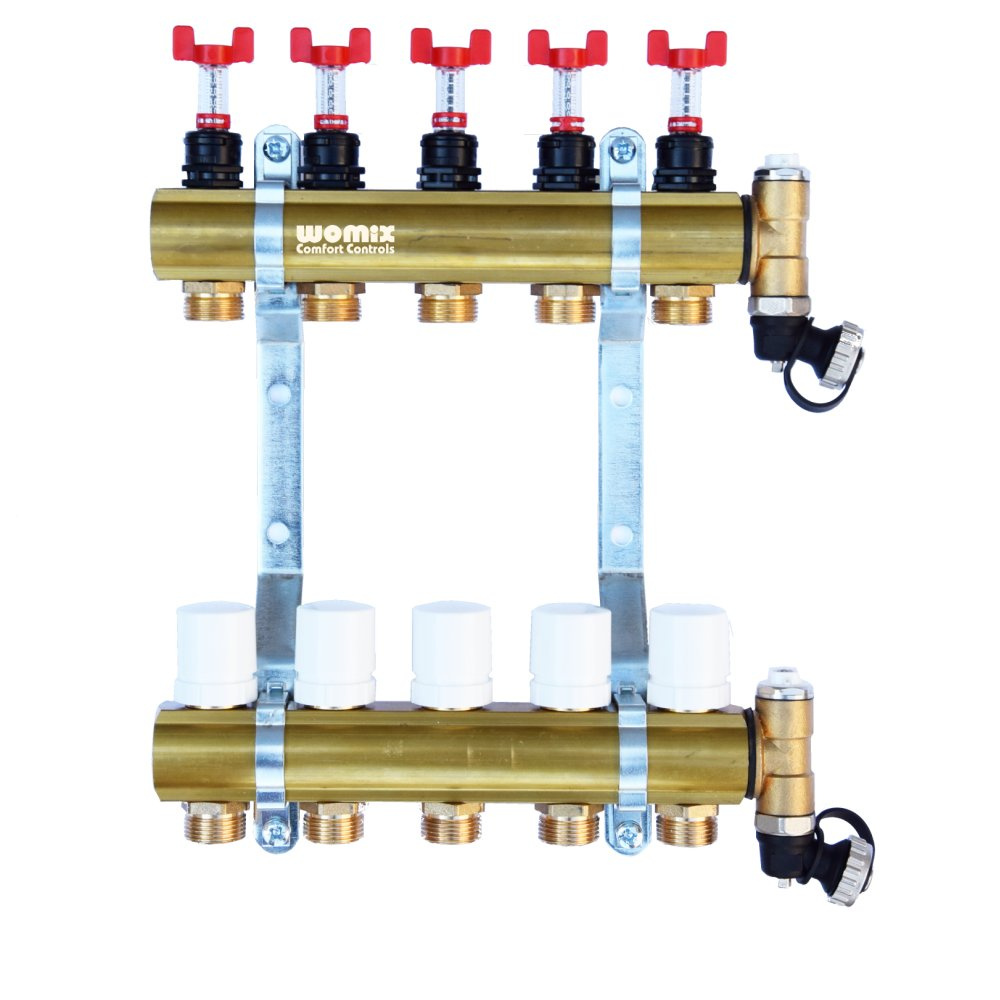 Model CM-NTRot. Rozdzielacz Do Ogrzewania Płaszczyznowego Na 5 Obwodów Grzewczych, Z Nyplami Redukcyjnymi 1/2” X 3/4”, Z Wkładkami Termostatycznymi I Rotametrami 0,5 – 5 L/Min, 2 Odpowietrznikami Oraz Zaworami Spustowymi Kątowymi.