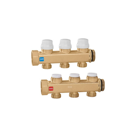 Para rozdzielaczy. Z zaworami odcinającymi i zaworami do wstępnej regulacji natężenia przepływu. Przyłącze: G 1" (ISO 228-1) GW, wlot, Podłączenie do złączek Caleffi. Przyłącze: G 1" A (ISO 228-1) GZ, wylot. przyłącza wylot: G 3/4" A (ISO 228-1) GZ, 5 wyjść. Maksymalne ciśnienie pracy: 10 bar. Zakres temperatury medium: 5–100 °C. Rozstaw wyjść: 50 mm.