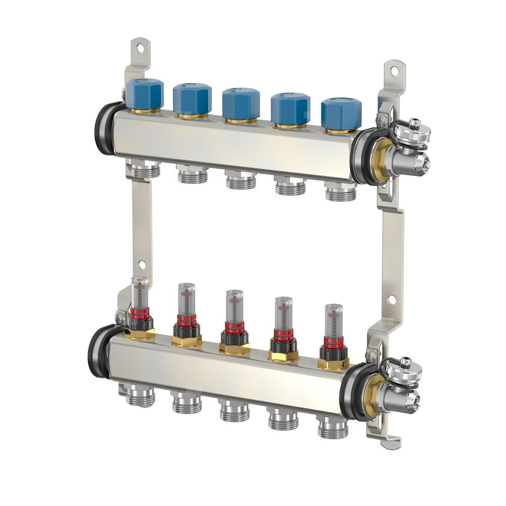 Rozdzielacz ze stali nierdzewnej z uchwytem sciennym z izolacja. Belka zasilająca: GW 1", złaczki niklowane 3" GZ Eurokonus (2-12 szt.), obrotowy korek zaslepiajacy 3" GZ Eurokonus z funkcja napełniania, oprózniania oraz odpowietrzania (1 szt.), zintegrowane rotametry 0-5 l/min. (2-12 szt.). Belka powrotna: GW 1", złaczki niklowane 3" GZ Eurokonus (2-12 szt.), obrotowy korek zaslepiajacy 3" GZ Eurokonus z funkcja napełniania, oprózniania oraz odpowietrzania (1 szt.), zintegrowane wkładki termostatyczne zaworów M30 x 1,5 (2-12 szt.) mozliwosc doposazenia w siłowniki. Materiał: stal nierdzewna