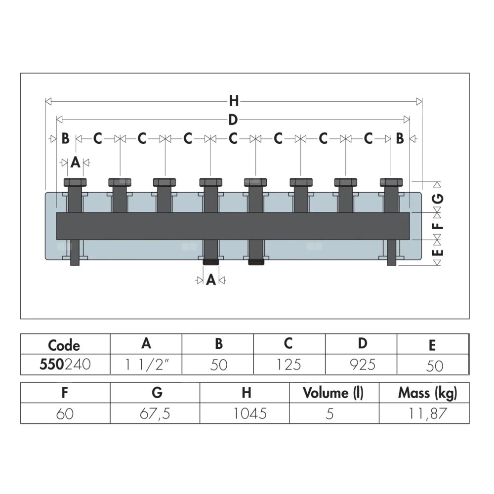 Rozdzielacz do instalacji grzewczych i chłodniczych. 4 wyjścia. Z izolacją. W komplecie ze wspornikami ze stali. główne podłączenie: G 1 1/2" A (ISO 228-1) GZ. przyłącza wylot: G 1 1/2" (ISO 228-1) GW. Maksymalne ciśnienie pracy: 6 bar. Zakres temperatury medium: 5–110 °C. Rozstaw przyłączy głównych: 125 mm. Materiał: stal.