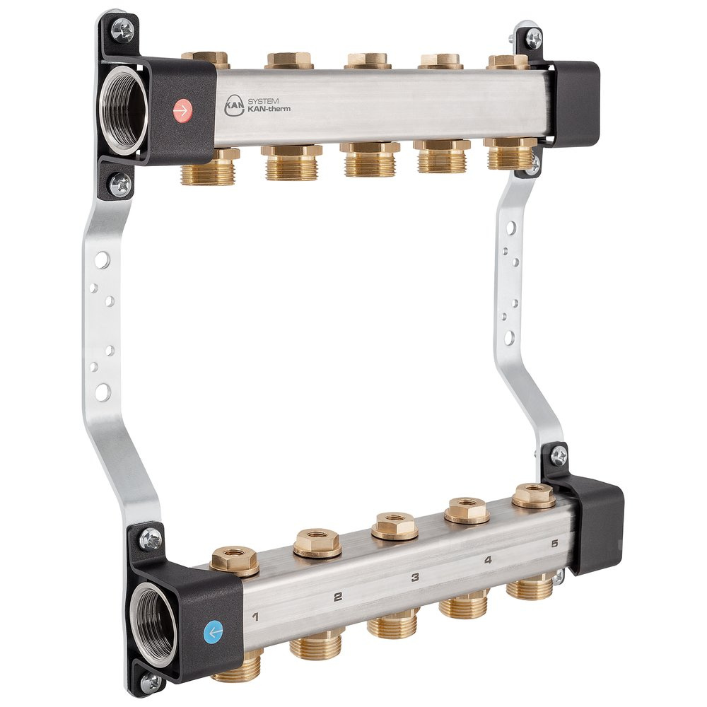 Rozdzielacz InoxFlow bez osprzętu (seria RVV) - 2-12 obwodów. Belka ze stali nierdzewnej 1.4301 (AISI) 3040 o profilu 1¼" z rozstawek belek 235mm. Belki (zasilająca i powrotna) z przyłączami instalacyjnymi na GW1", nyplami GW ¾" z rozstawem 50mm jako wyjścia poszczególnych obwodów wyposażone w indywidualne zawory odcinające i obejmami wyposazonymi we wkładki elastometrowe tłumiące drgania. Otwór ½" w górnej części belek pod odpowietrznik. Belki Belki nie sa wyposażone w zaślepki