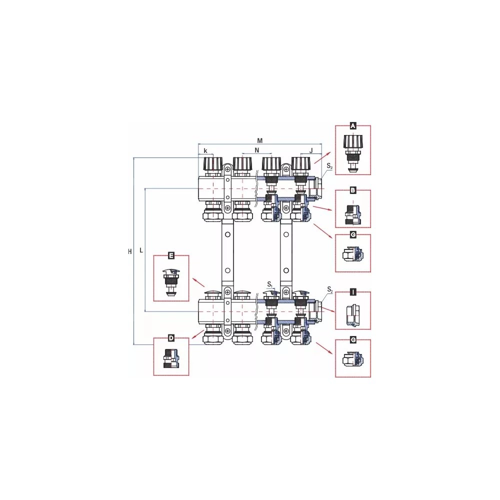 Rozdzielacze podłogowego ogrzewania przeznaczonesą do rozdzielenia medium grzewczegona poszczególne pętle grzewcze. W skład rozdzielacza 70B wchodzą: belka zasilająca     A  - zawory regulujące ręczne z pokrętłem      B  - nyple 1/2" x 3/4" z oringiem      G  - zaciski do rury pex/all/pex belka powrotna     E  - zawory regulujące ręczne na imbus      D  - nyple 1/2" x 3/4" z oringiem     G  - zaciski do rury pex/all/pex 2 uchwyty montażowe z amortyzatorami I  - 2 korki 1” z oringiem na klucz