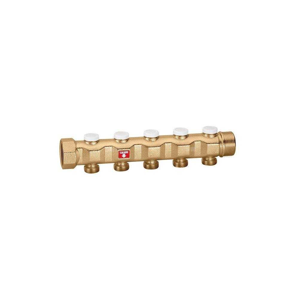 Rozdzielacz zasilający. Z zaworami do wstępnej regulacji natężenia przepływu. Przyłącze: G 1 1/4" (ISO 228-1) GW, wlot, Podłączenie do złączek Caleffi. Przyłącze: G 1 1/4" A (ISO 228-1) GZ, wylot. przyłącza wylot: G 3/4" A (ISO 228-1) GZ, 7 wyjść. Maksymalne ciśnienie pracy: 10 bar. Zakres temperatury medium: 5–100 °C. Rozstaw wyjść: 50 mm.