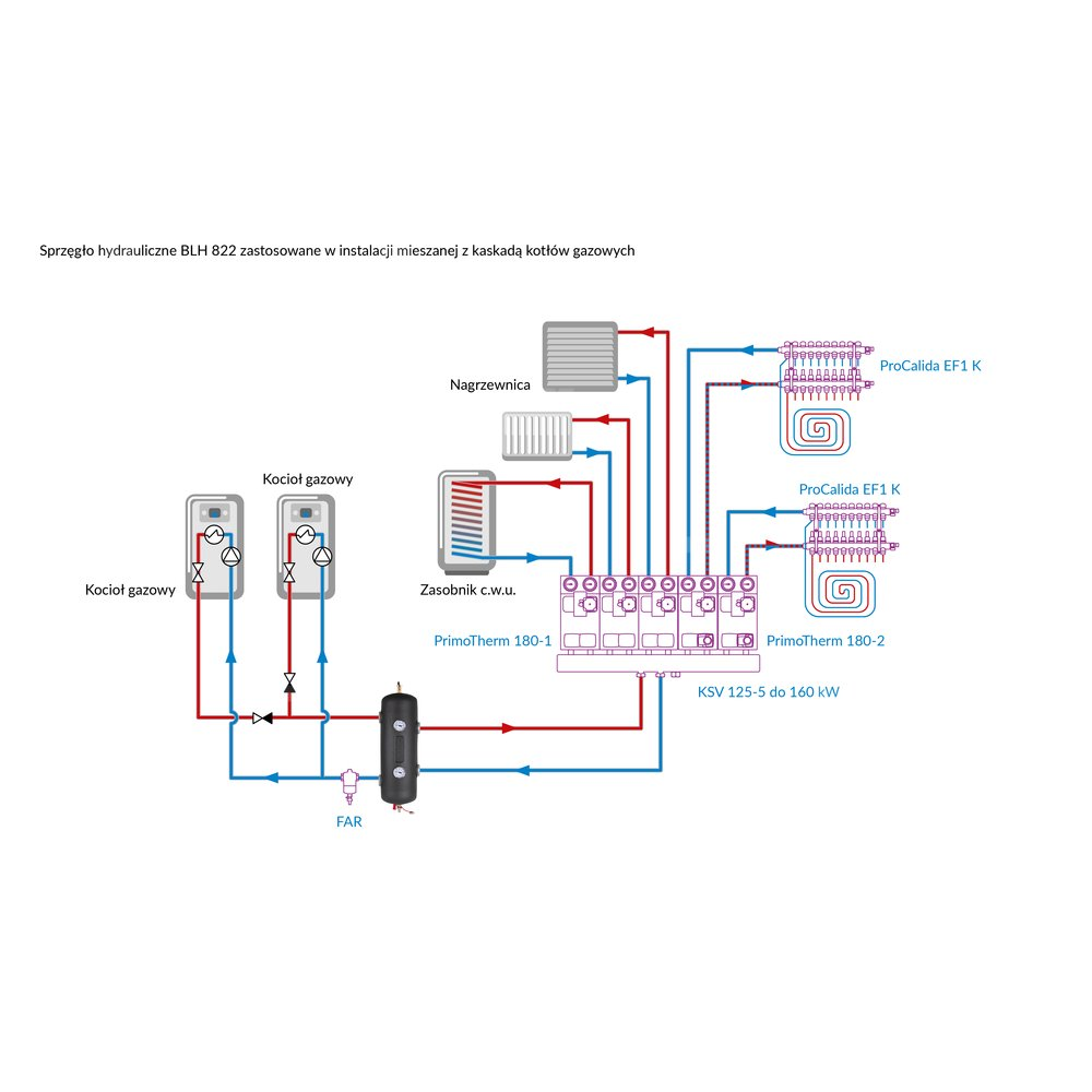 Sprzęgło hydrauliczne ocieplone BLH 822, 200 kW, 4x GW G2'', 6x GW G1/2'' odpowietrznik automatyczny, zawór spustowy, termometry, tuleja zanurzeniowa, korek