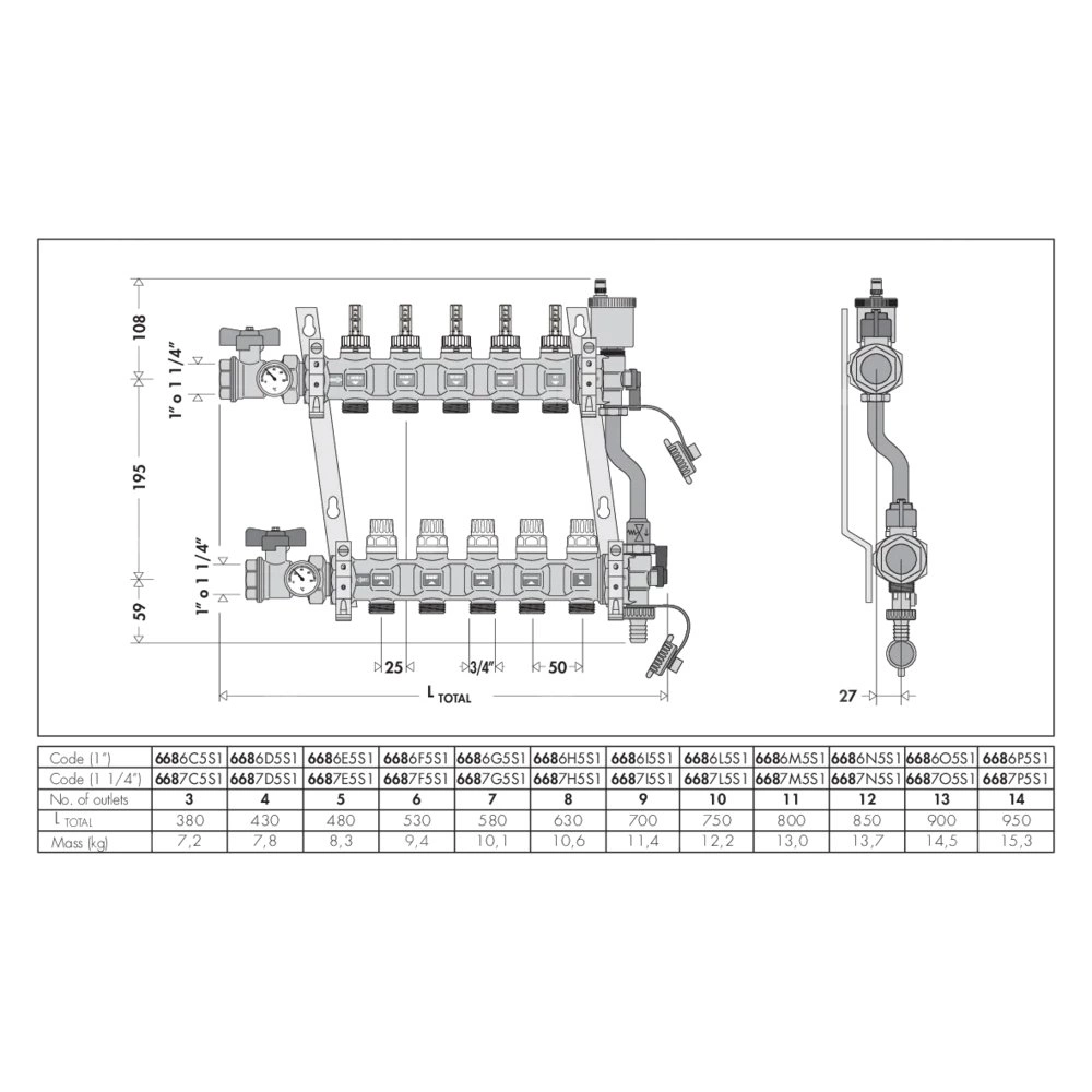 Zespół rozdzielaczy Zawiera: - rozdzielacz zasilający z wbudowanymi przepływomierzami i zaworami równoważącymi natężenie przepływu; - rozdzielacz powrotny z wbudowanymi zaworami odcinającymi z przyłączem do siłownika termoelektrycznego; - zakończenia rozdzielacza z wielopozycyjnym zaworem kulowym, automatycznym odpowietrznikiem i króćcem napełniającym/spustowym; - niecentryczne obejście różnicowe ze stałą nastawą i rurą połączeniową; - zawory odcinające kulowe; - uchwyty montażowe do montażu w skrzynce lub montażu naściennego główne podłączenie: G 1" (ISO 228-1) GW, Podłączenie do złączek Caleffi. przyłącza wylot: G 1" (ISO 228-1) GW, 9 wyjść. Maksymalne ciśnienie pracy: 10 bar. Zakres temperatury medium: 0–80 °C.