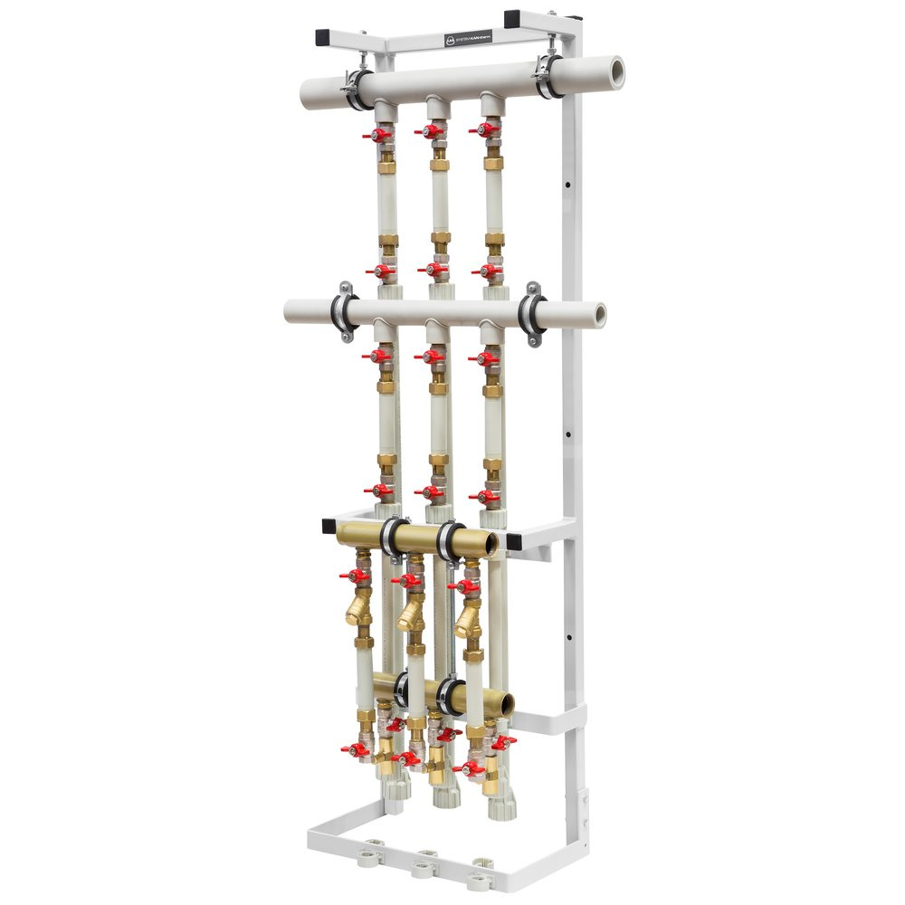 Zespół rozdzielaczy mieszkaniowych dla 2 - 8 mieszkań. Kolektor modułu centralnego ogrzewania ze stali zabezpieczonej antykorozyjnie; Kolektory modułu ciepłej i zimnej wody użytkowej z polipropylenu PP-R