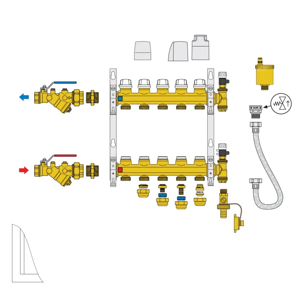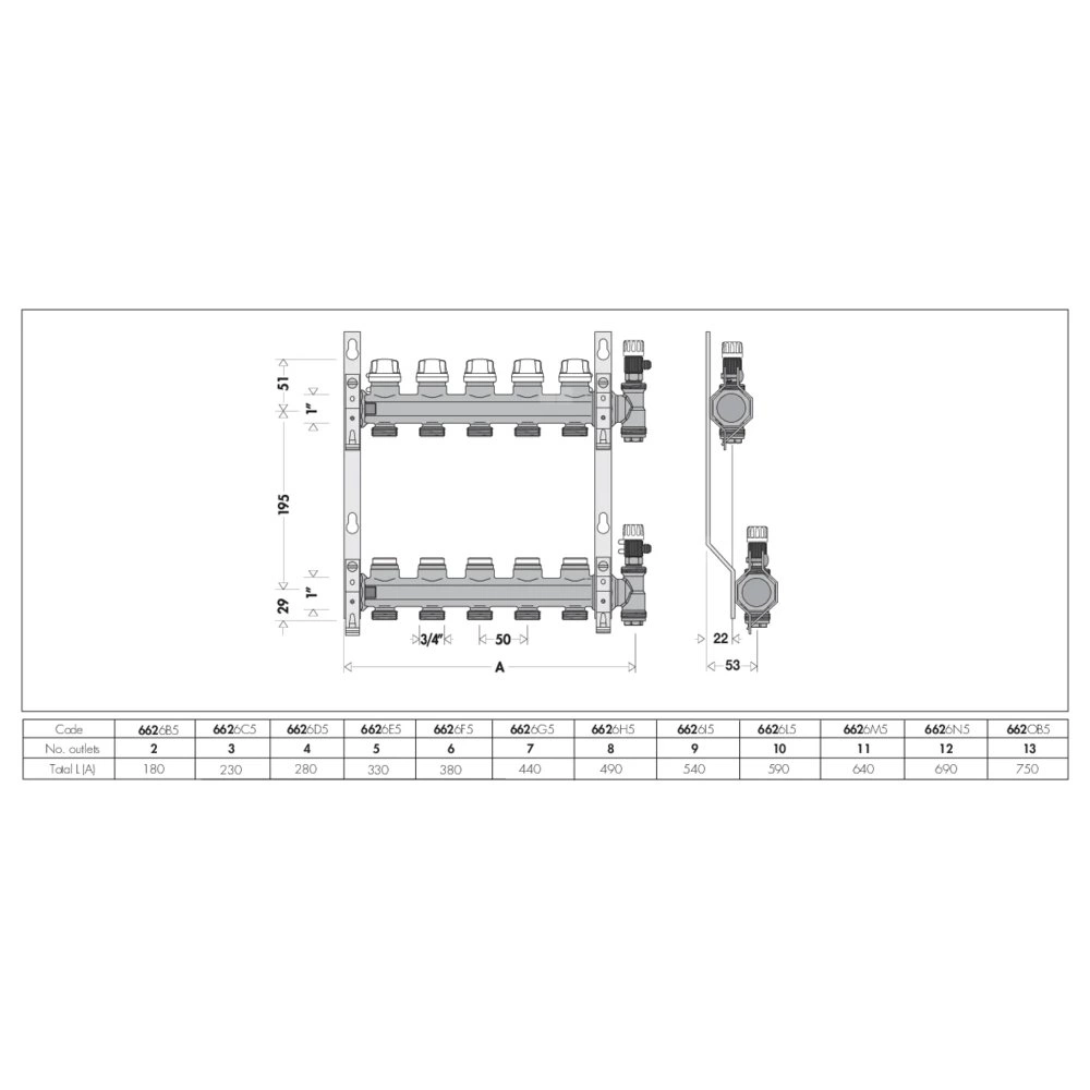 Zespół rozdzielaczy. Zawiera: -rozdzielacz powrotny z zaworami odcinającymi z możliwością przyłączenia siłownika termoelektrycznego; - rozdzielacz zasilający z zaworami do wstępnej regulacji natężenia przepływu; - zakończenia rozdzielacza z ręcznymi zaworami odpowietrzającymi i korkami; - uchwyty montażowe z polimeru z możliwością regulacji rozstawu do użycia ze skrzynką serii 659 lub 661 lub do montażu bezpośrednio na ścianie. Przyłącze: G 1" (ISO 228-1) GW, Podłączenie do złączek Caleffi. przyłącza wylot: G 3/4" A (ISO 228-1) GZ, 4 wyjścia. Maksymalne ciśnienie pracy: 10 bar. Zakres temperatury medium: 5–100 °C. Rozstaw wyjść: 50 mm.
