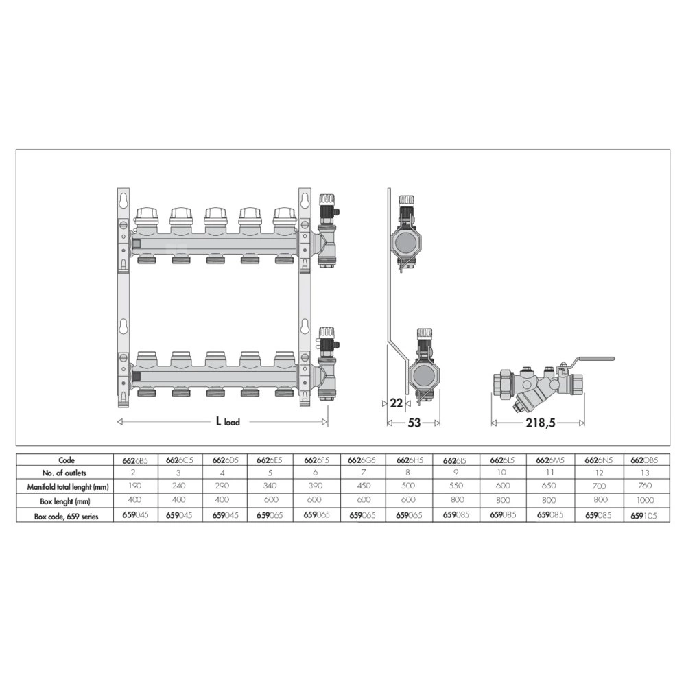 Zespół rozdzielaczy. Zawiera: -rozdzielacz powrotny z zaworami odcinającymi z możliwością przyłączenia siłownika termoelektrycznego; - rozdzielacz zasilający z zaworami do wstępnej regulacji natężenia przepływu; - zakończenia rozdzielacza z ręcznymi zaworami odpowietrzającymi i korkami; - uchwyty montażowe z polimeru z możliwością regulacji rozstawu do użycia ze skrzynką serii 659 lub 661 lub do montażu bezpośrednio na ścianie. Przyłącze: G 1" (ISO 228-1) GW, Podłączenie do złączek Caleffi. przyłącza wylot: G 3/4" A (ISO 228-1) GZ, 6 wyjść. Maksymalne ciśnienie pracy: 10 bar. Zakres temperatury medium: 5–100 °C. Rozstaw wyjść: 50 mm.