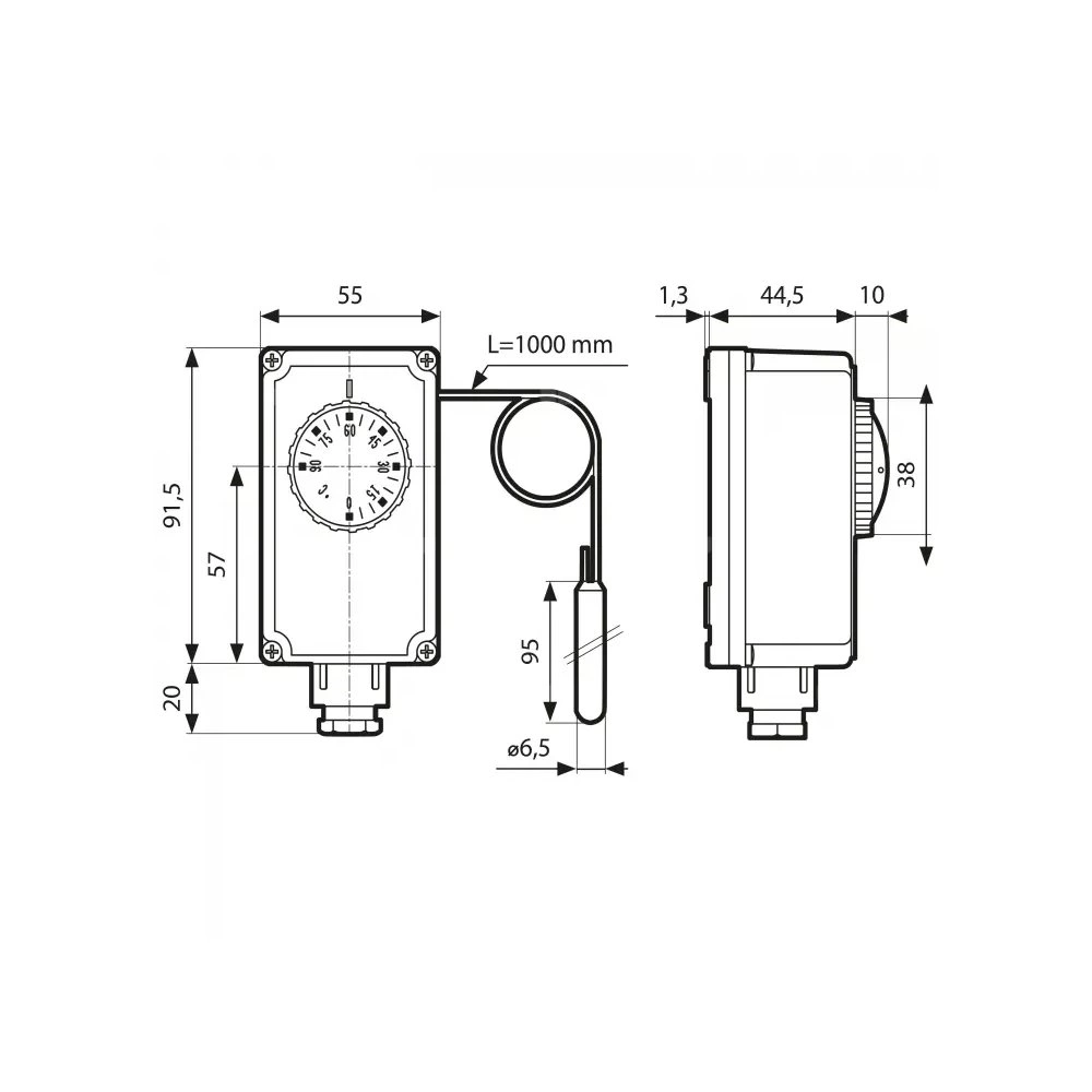 Wyposażony w kapilarę o długości 1000mm, co umożliwia montaż termostatu z dala od miejsca pomiaru.