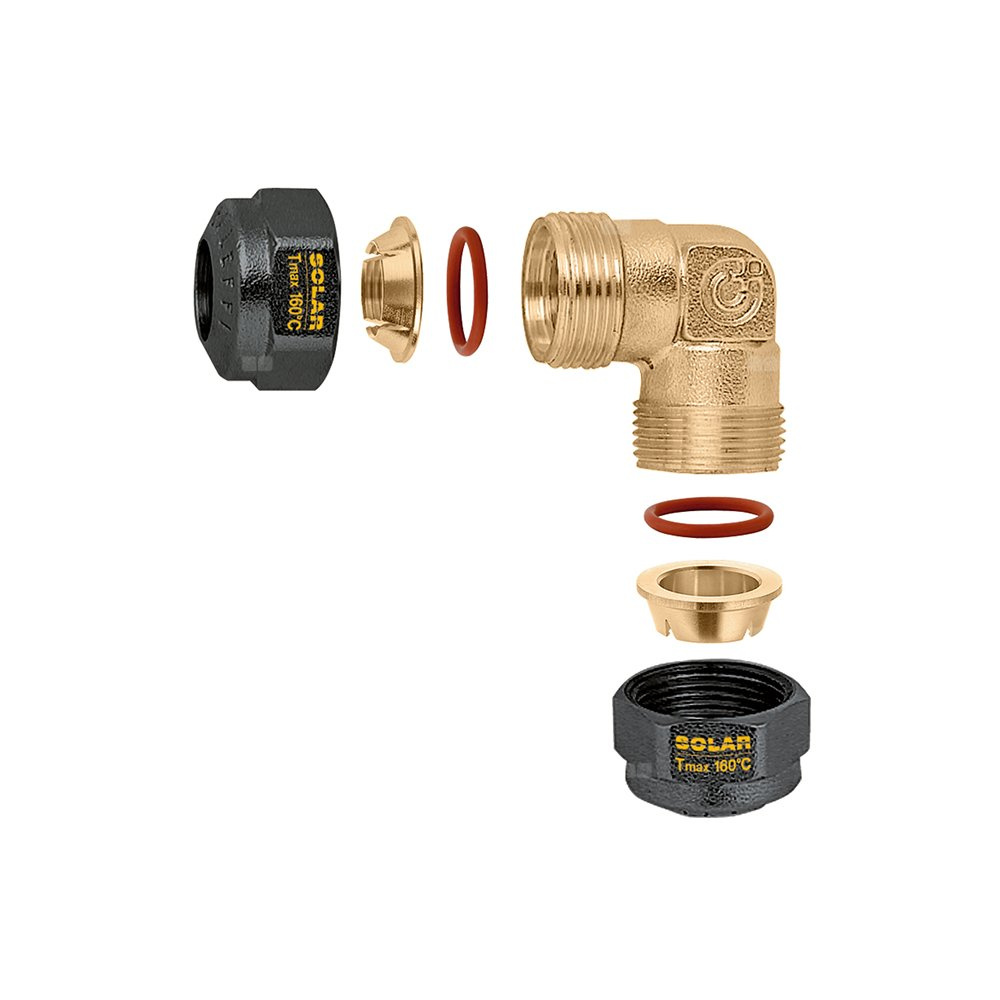 Kolanko, skręcane, uszczelka O-Ring do instalacji solarnych Do rur z miedzi wyżarzonej, twardej miedzi, mosiądzu, stali miękkiej i stali nierdzewnej. Nakrętka niklowana, czarna. Przyłącze: Ø 22. Maksymalne ciśnienie pracy: 16 bar. Zakres temperatury medium: -30–160 °C. Maksymalne stężenie glikolu: 50 %. Medium: woda, Roztwory glikolu.