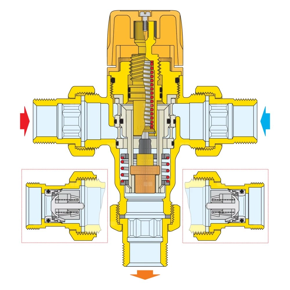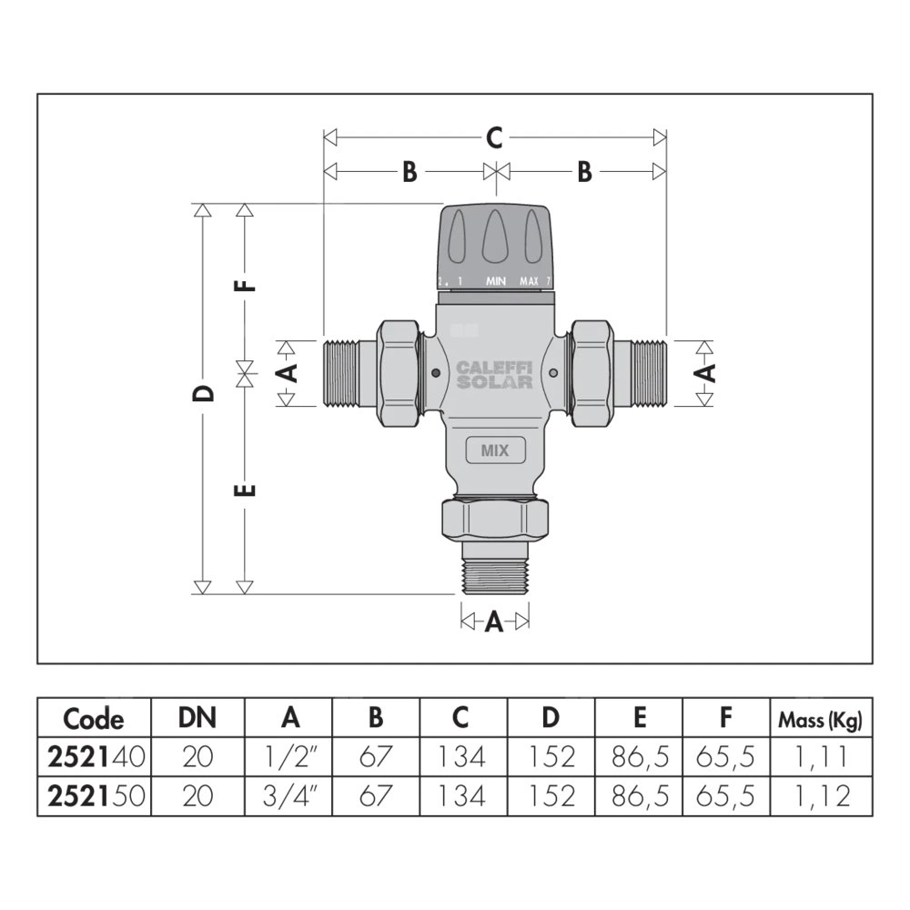 Regulowany termostatyczny zawór mieszający, do instalacji solarnych Przyłącze: G 3/4" A (ISO 228-1) GZ, złączka. Maksymalne ciśnienie pracy: 14 bar. Zakres temperatury medium: 0–100 °C. Zakres regulacji temperatury: 30–65 °C. Wykończenie: chromowane. Kv: 2,6 m³/h. Materiał: stop mosiądzu odporny na odcynkowanie.