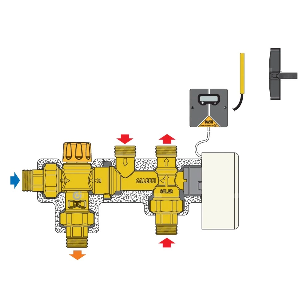 - termostatyczny antyoparzeniowy zawór mieszający do instalacji solarnych regulowany przy użyciu pokrętła. Wyposażony w filtry i zawory zwrotne na wlotach;