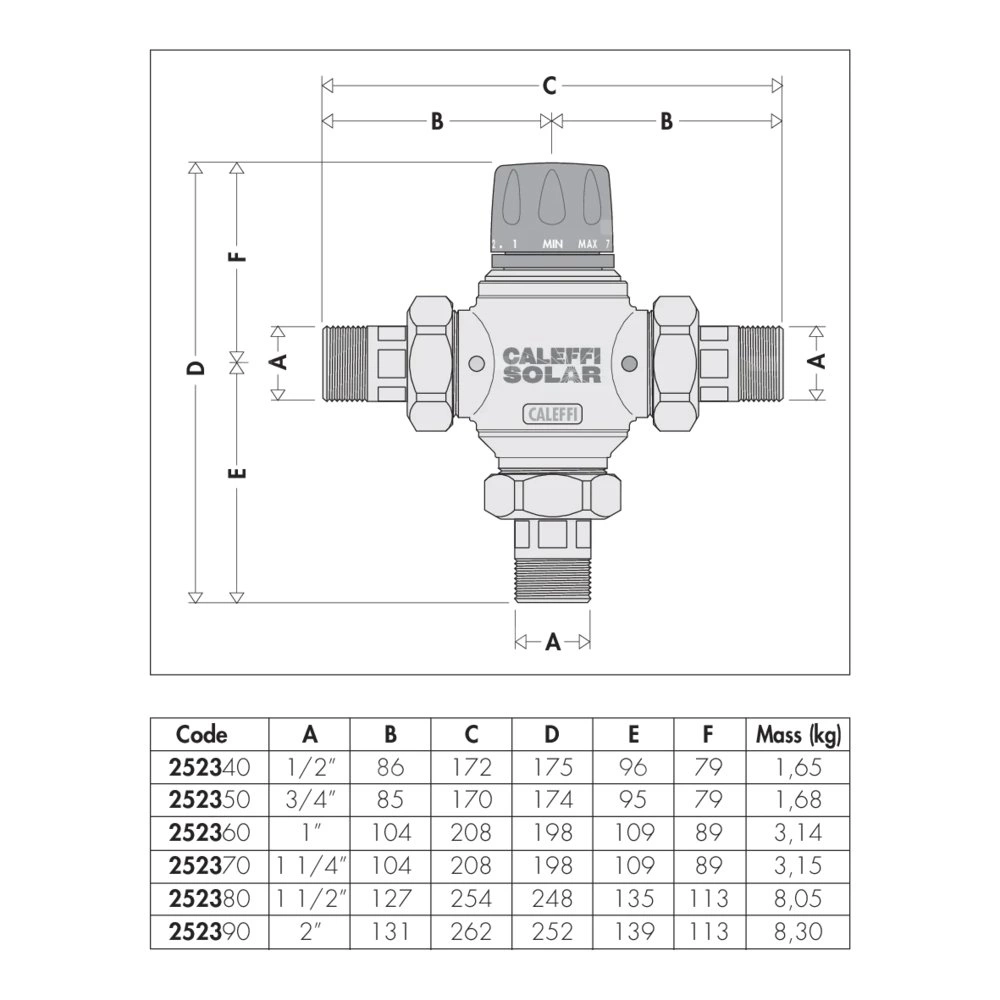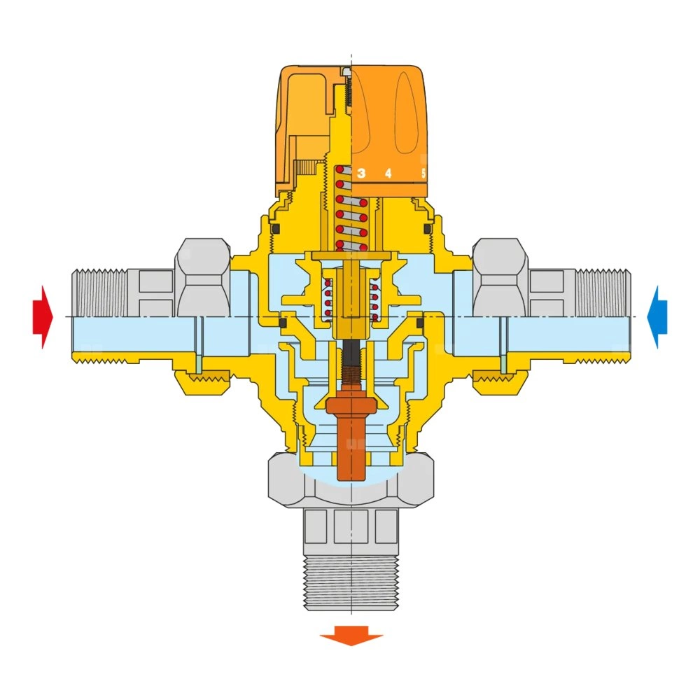 Termostatyczny zawór mieszający, z wymiennym wkładem, do instalacji solarnych Przyłącze: G 1 1/2" A (ISO 228-1) GZ, złączka. Maksymalne ciśnienie pracy: 14 bar. Zakres temperatury medium: 0–110 °C. Zakres regulacji temperatury: 35–65 °C. Kv: 14,5 m³/h. Materiał: mosiądz.