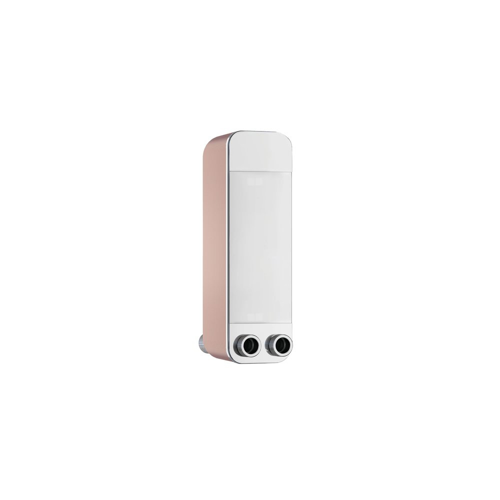 lutowany dwubiegowy płytowy wymiennik ciepła ze stali nierdzewnej (1.4404), lutowany próżniowo miedzią. Wielkości R..B-14 do R..B-110 z przyłączem gwintowanym, R..B-235 z przyłączem kołnierzowym DIN.