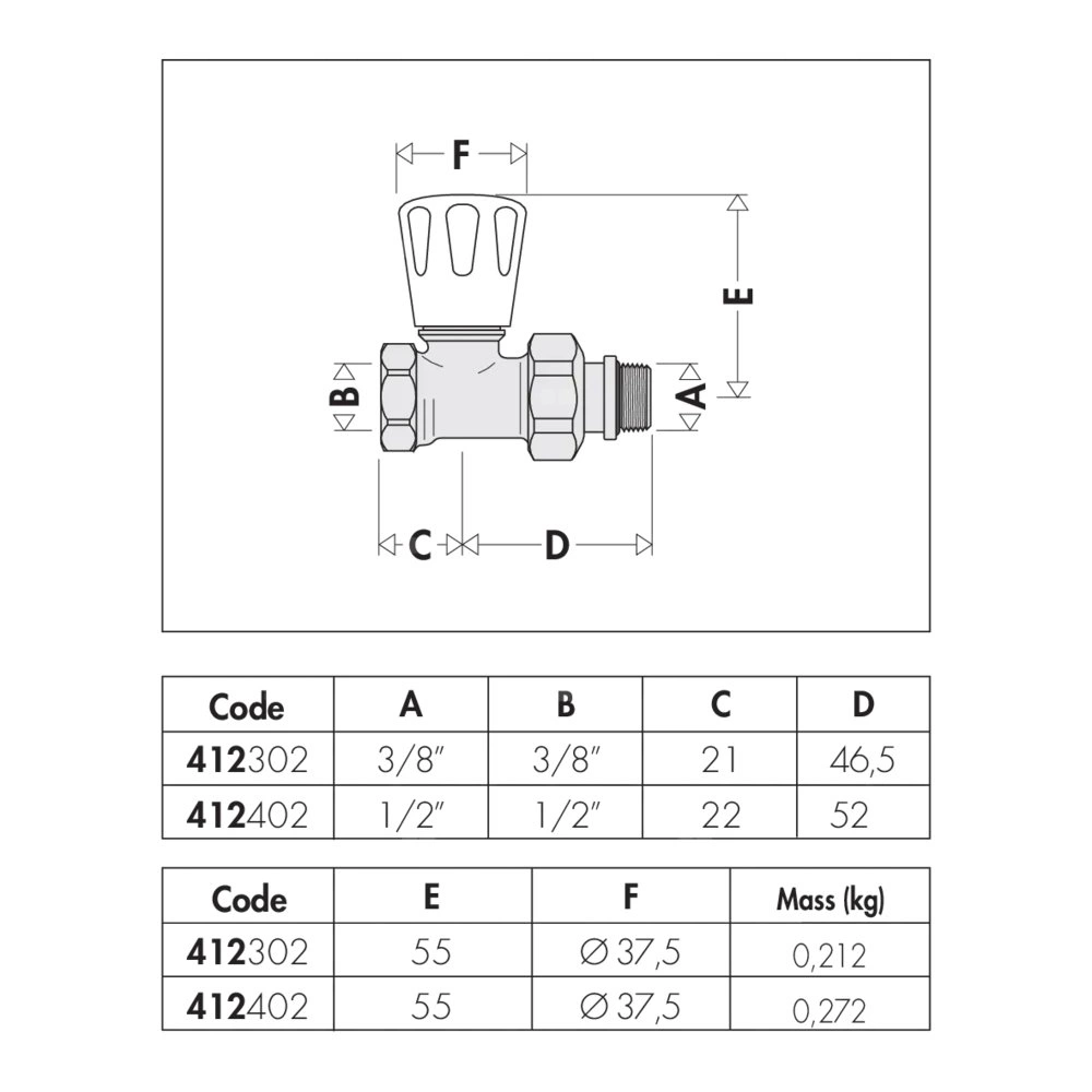 Prosty ręczny zawór grzejnikowy. podłącznie rury: G 3/8" (ISO 228-1) GW, wlot, podłączenie proste. podłączenie grzejnika: G 3/8" A (ISO 228-1) GZ, wylot, podłączenie proste. Maksymalne ciśnienie pracy: 10 bar. Zakres temperatury medium: 5–100 °C. Wykończenie: chromowane. Kv: 1,32 m³/h. Materiał: mosiądz.
