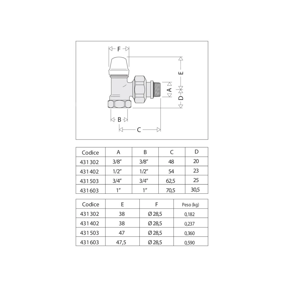 Kątowy, grzejnikowy zawór odcinający podłącznie rury: G 3/8" (ISO 228-1) GW, wlot, podłączenie kątowe. podłączenie grzejnika: G 3/8" A (ISO 228-1) GZ, wylot, podłączenie kątowe. Maksymalne ciśnienie pracy: 10 bar. Zakres temperatury medium: 5–100 °C. Wykończenie: chromowane. Kvs: 2,42 m³/h. Materiał: mosiądz.