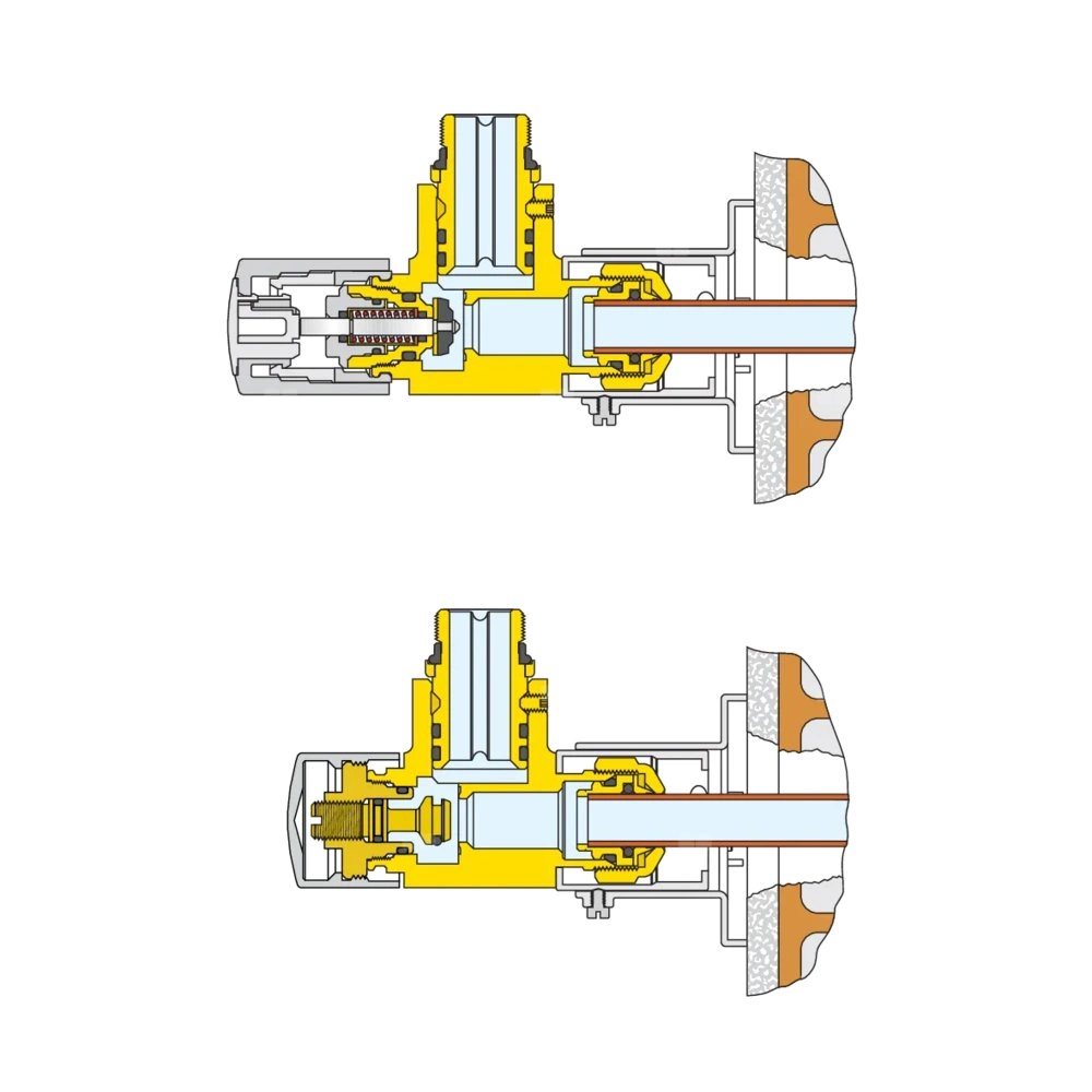 - 3-osiowy grzejnikowy zawór termostatyczny z pokrętłem przystosowany do montażu głowicy termostatycznej serii 200015;