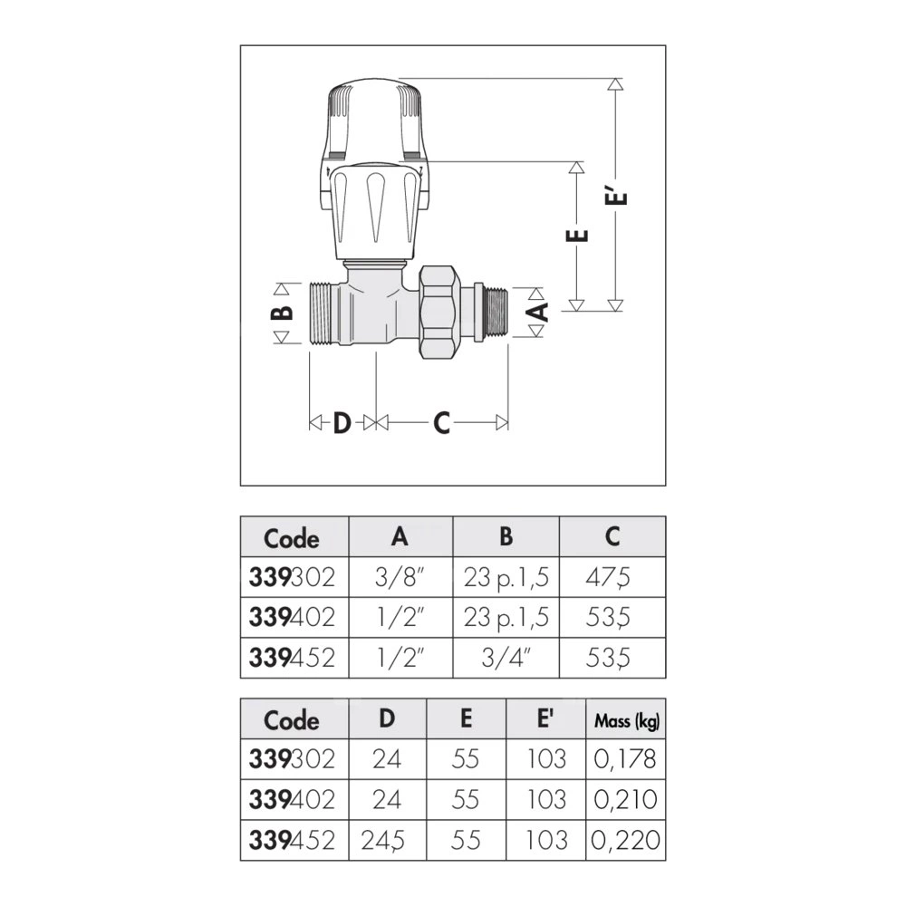 Prosty grzejnikowy zawór termostatyczny z pokrętłem przystosowany do montażu głowic termostatycznych, elektronicznych i siłowników termoelektrycznych. podłącznie rury: 23 p. 1,5, wlot, podłączenie proste, Podłączenie do złączek Caleffi. podłączenie grzejnika: G 3/8" A (ISO 228-1) GZ, wylot, podłączenie proste. Maksymalne ciśnienie pracy: 10 bar. Zakres temperatury medium: 5–100 °C. Wykończenie: chromowane. Kv: 1,35 m³/h. Materiał: mosiądz.
