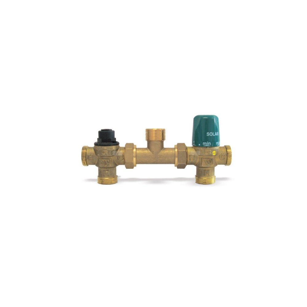 Zestaw termostatyczny służący do łączenia wody z instalacji solarnej z wodą podgrzewaną w urządzeniu grzewczym, w celu termicznej integracji instalacji.