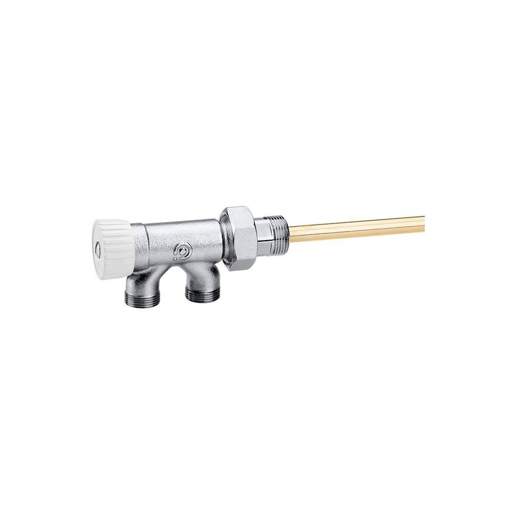 Zawór grzejnikowy do instalacji jednorurowych Natężenie przepływu do grzejnika: 100%. Bez szablonu naściennego i rozety maskującej. podłączenie grzejnika: G 1/2" A (ISO 228-1) GZ, wlot, Podłączenie do złączek Caleffi. podłącznie rury: 23 p. 1,5, wylot. Maksymalne ciśnienie pracy: 10 bar. Zakres temperatury medium: 5–100 °C. Rozstaw przyłączy głównych: 40 mm. Wykończenie: chromowane. Długość sondy: 30 cm. Kv: 3,20 m³/h. Materiał: mosiądz.