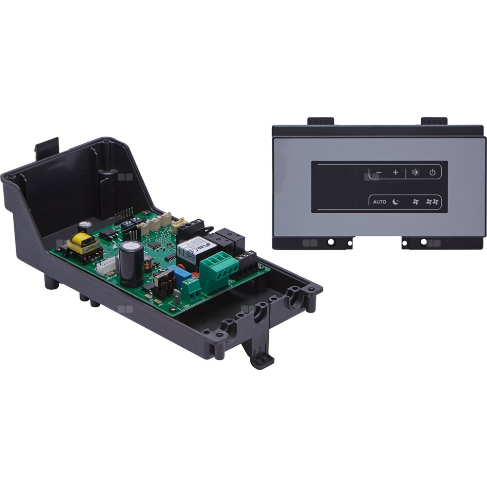 Zestaw termoregulacji modulującej, w tym: panel sterowania z wyświetlaczem, płytka elektroniczna i sonda NTC do pomiaru temperatury w pomieszczeniu.