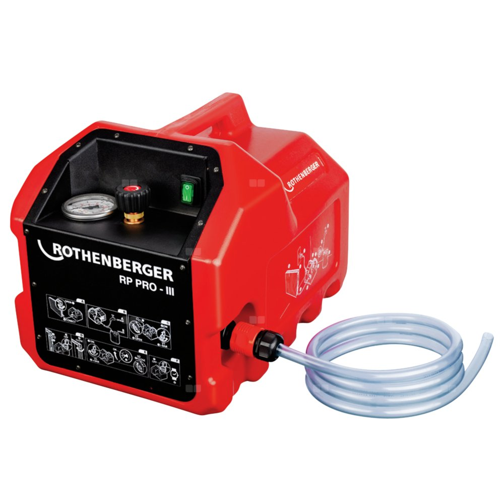 Praktyczna, intuicyjna, wygodna - siła RP PRO III leży w automatycznej próbie ciśnieniowej systemów rurowych i zbiorników do 40 bar. Jednocześnie automatyczny wyłącznik termiczny zapobiega przeciążeniu pompy. Wysoka wydajność w połączeniu z kompaktową konstrukcją zapewnia wygodną obsługę dla instalatora