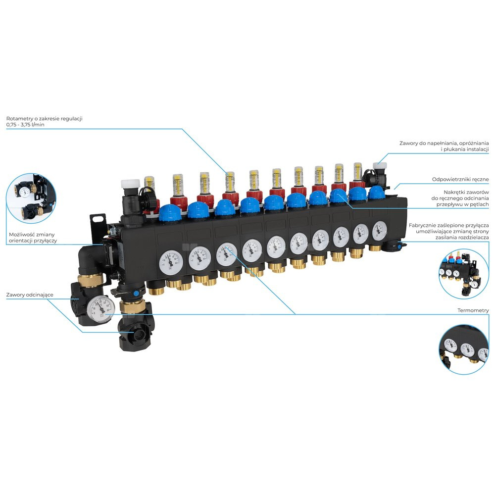 Rozprowadza ciepło / chłód ze źródła na poszczególne pętle instalacji płaszczyznowej.