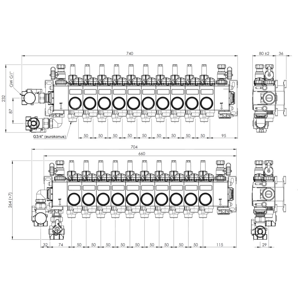 Poliamidowe zawory odcinające ułatwiają pracę konserwacyjne oraz napełnianie oraz płukanie pętli. Zawór na zasilaniu posiada termometr.