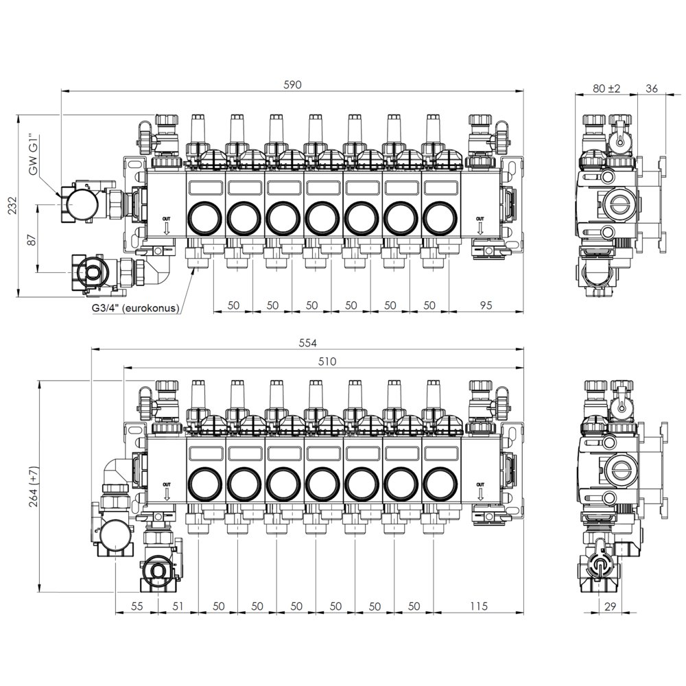 Poliamidowe zawory odcinające ułatwiają pracę konserwacyjne oraz napełnianie oraz płukanie pętli. Zawór na zasilaniu posiada termometr.