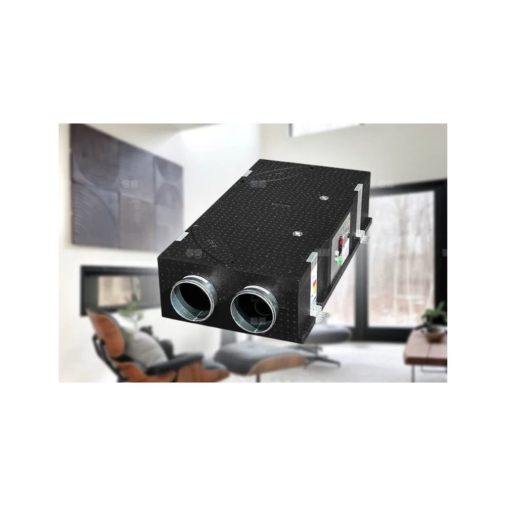 Rekuperator BREVA 200 płaski z by-passem, obudowa EPP wzmacniana metalowym stelażem, do podwieszenia pod sufitem lub lokalizacji na podłodze, wyposażony w sterownik EVO LT