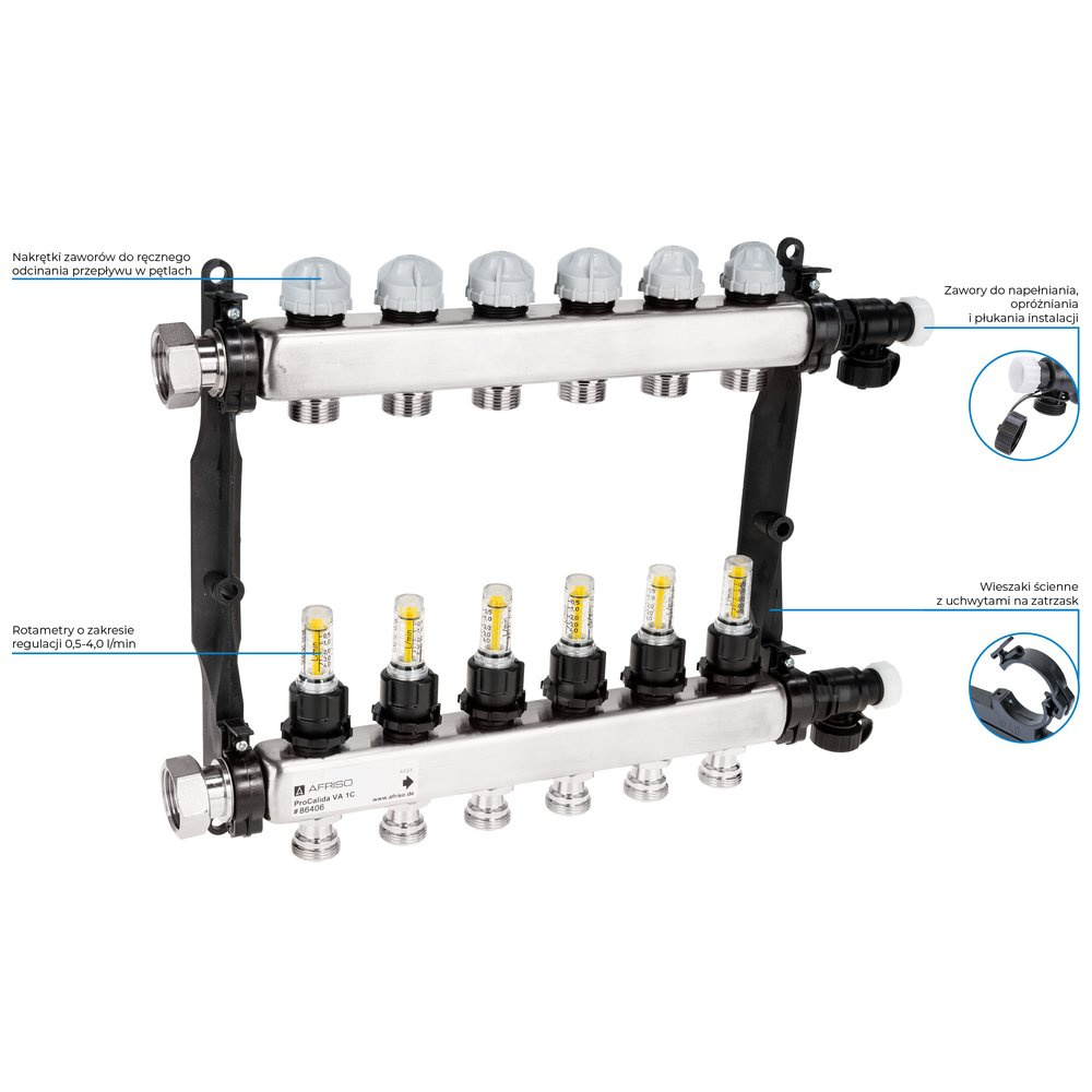 Rozdzielacz do ogrzewania podłogowego AFRISO ProCalida VA 1C 6-obieg. stal nierdzewna GZ 1'' x euroconus 3/4''