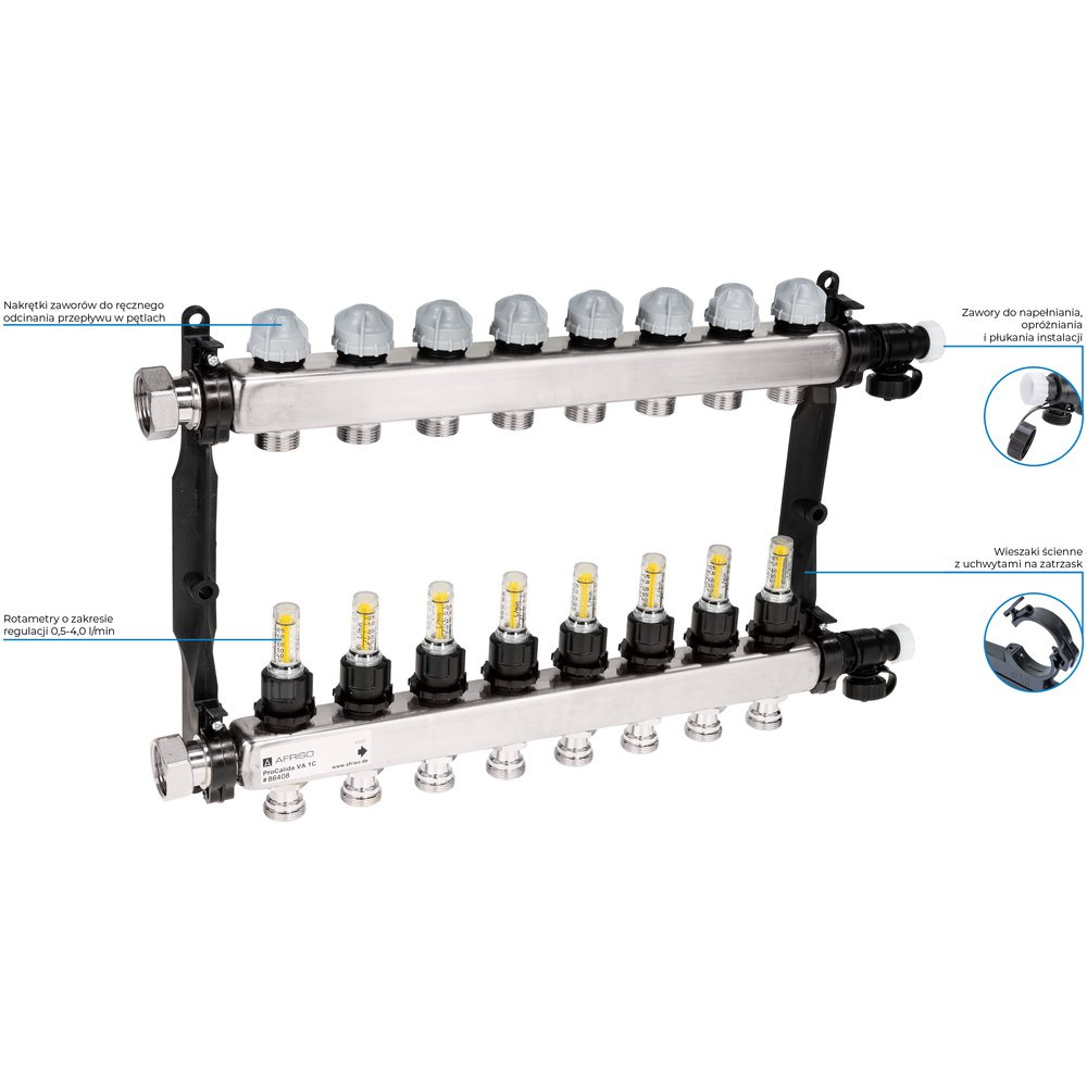 Rozdzielacz do ogrzewania podłogowego AFRISO ProCalida VA 1C 8-obieg. stal nierdzewna GZ 1'' x euroconus 3/4''