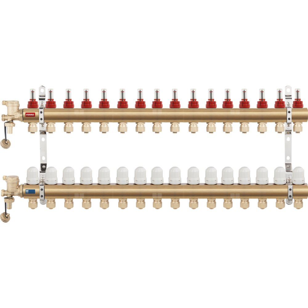 Rozdzielacz mosiężny z zaworami termostatycznymi i przepływomierzami, 13-drogowy