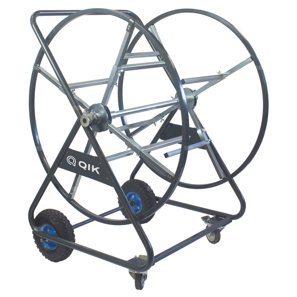 Rozkładany rozwijak bębnowy ze stali do rur QIK PE-RT I/EVOH/PE-RT I, kręgi 600 m, wykonany na łożysku kulkowym, gwarantuje długotrwałą pracę. Wyposażony w dwa gumowe pompowane koła o średnicy 26 cm plus dwa koła gumowo-stalowe, skrętne z hamulcami, ułatwiające przemieszczanie się w pomieszczeniach i transporcie.