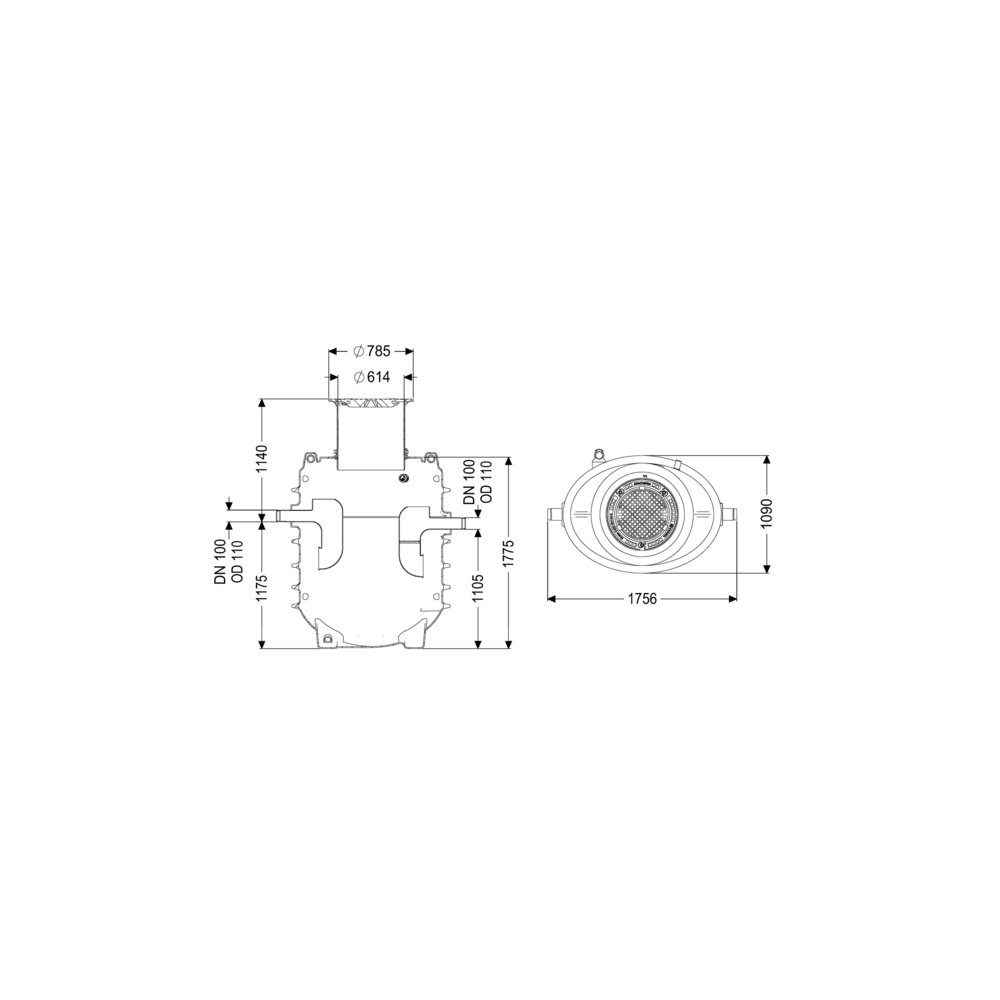 Odstęp między dnem rury dopływowej a dnem zbiornika: 1175 mm