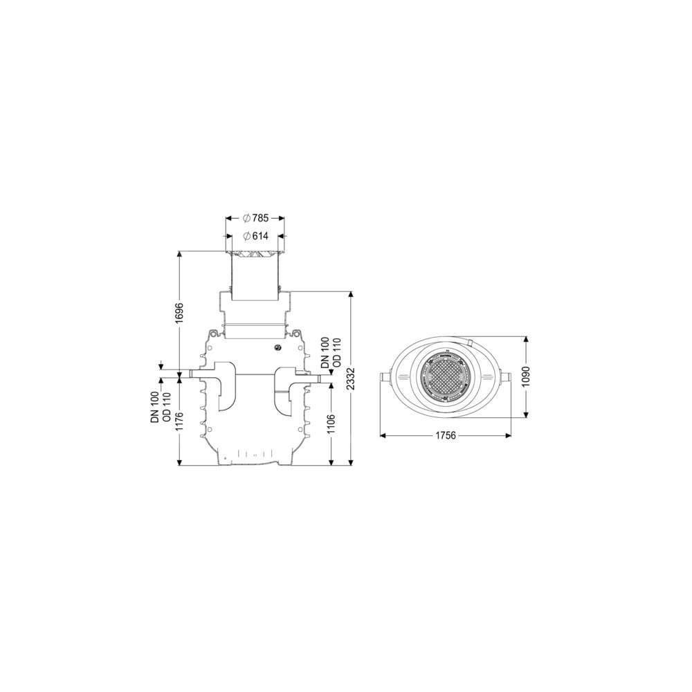 Odstęp między dnem rury dopływowej a dnem zbiornika: 1175 mm