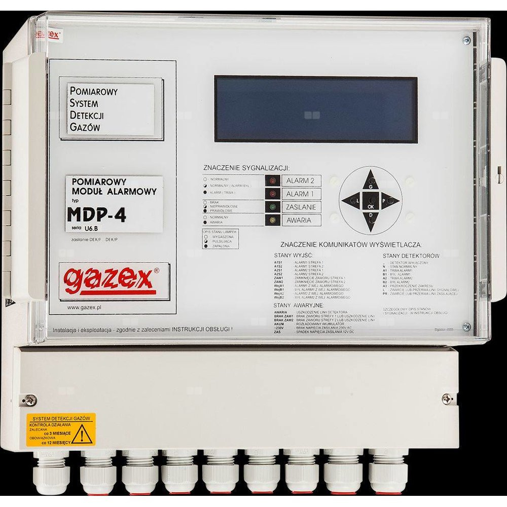 Pomiarowe moduły alarmowe typu MDP-4(8,16) są przeznaczone do kontroli i zasilania detektorów gazów typu DEX/F, DEX/P, DEX/A oraz DG/F, DG.EN, DG/P produkowanych przez GAZEX, do stosowania w Dwuprogowym (lub Pomiarowym) Systemie Detekcji Gazów lub w Aktywnym Systemie Bezpieczeństwa Instalacji Gazowej GX.