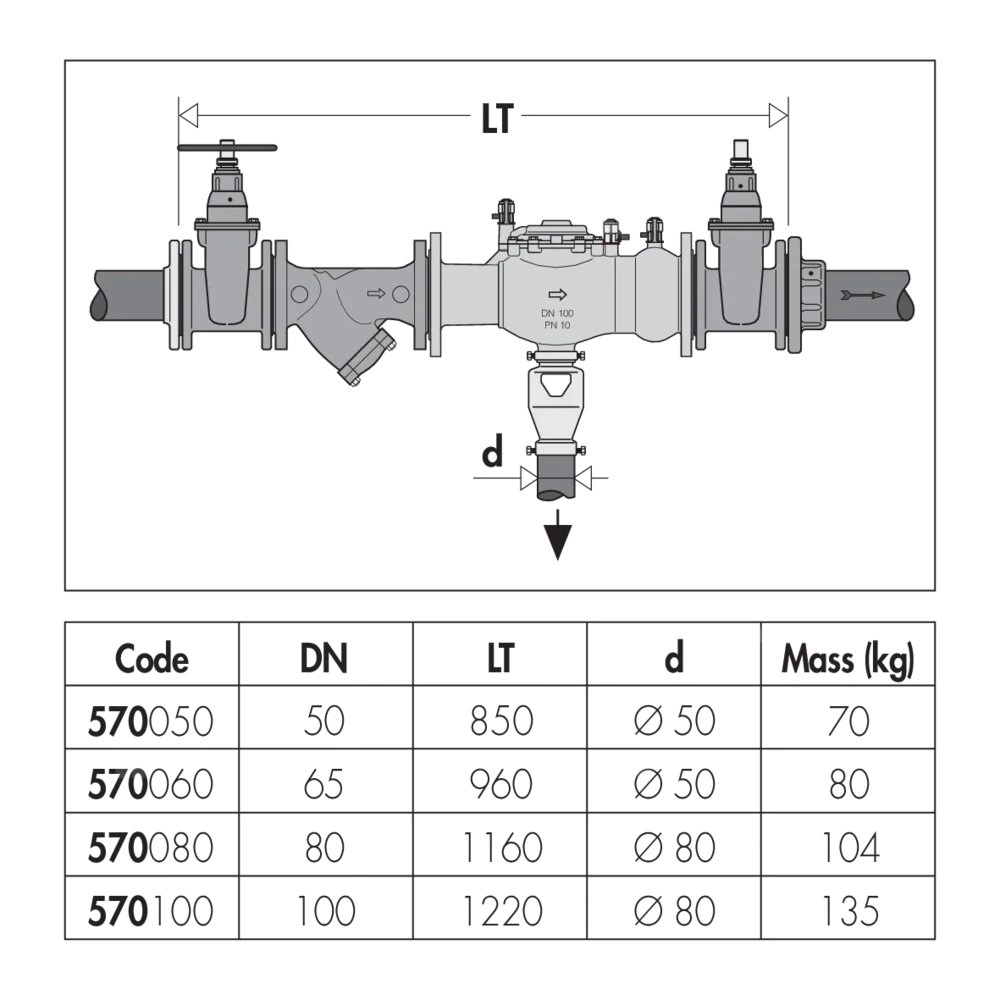 Zespół ochrony instalacji wodociągowej, przyłącza kołnierzowe PN 16. Współpraca z przeciwkołnierzem EN 1092-1. Zawiera: -izolator przepływów zwrotnych serii 575; -filtr skośny serii 579; -ręczne zawory odcinające. Przyłącze: DN 65 (EN 1092-1) PN 16. Zakres temperatury medium: 0–65 °C. PN (Ciśnienie nominalne): PN 10.