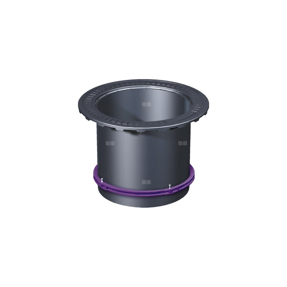 Nasada z pierścieniem zaciskowym do nieprzykręcanych pokryw (klasa A/B) systemów studzienki, z zawieszeniem osadnika (nr art. 860115), bezstopniowa regulacja wysokości o 500 mm (komfortowy system studzienki) lub 450 mm (standardowy system studzienki).