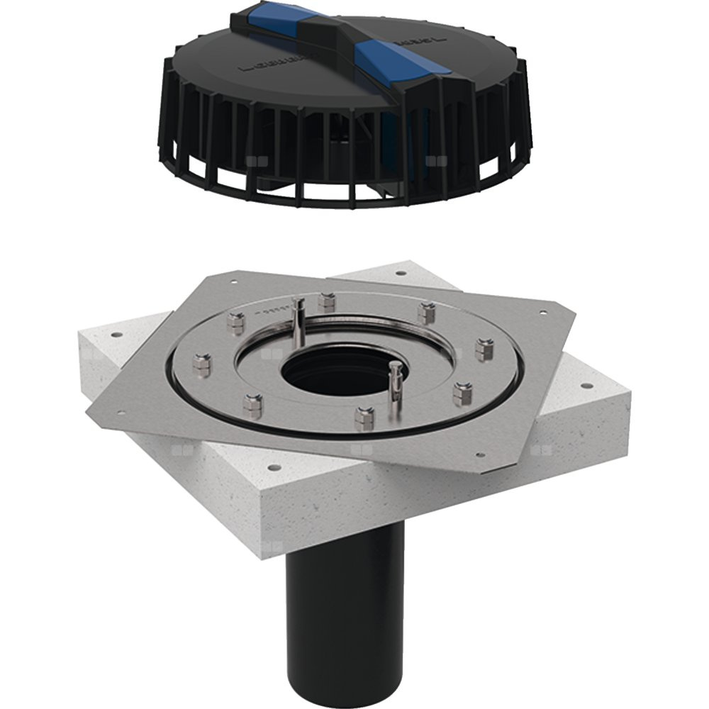 Kratka osłonowa z elementem wlotowym Element podstawowy z uniwersalnym kołnierzem przyłączeniowym ze stali CrNi 1.4301 Uszczelka kołnierzowa z EPDM Kołnierz mocujący z nakrętkami zabezpieczającymi Izolacja przeciwroszeniowa