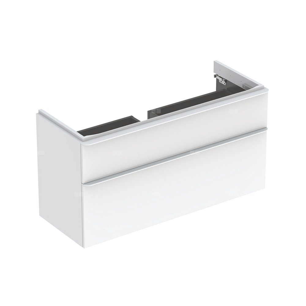 Szafka pod umywalkę Geberit Smyle Square, z dwoma szufladami: Szerokość umywalki=120cm, H=61.7cm, Korpus i front: biały / lakierowany na wysoki połysk, Uchwyt: biały / powlekany proszkowo, matowy
