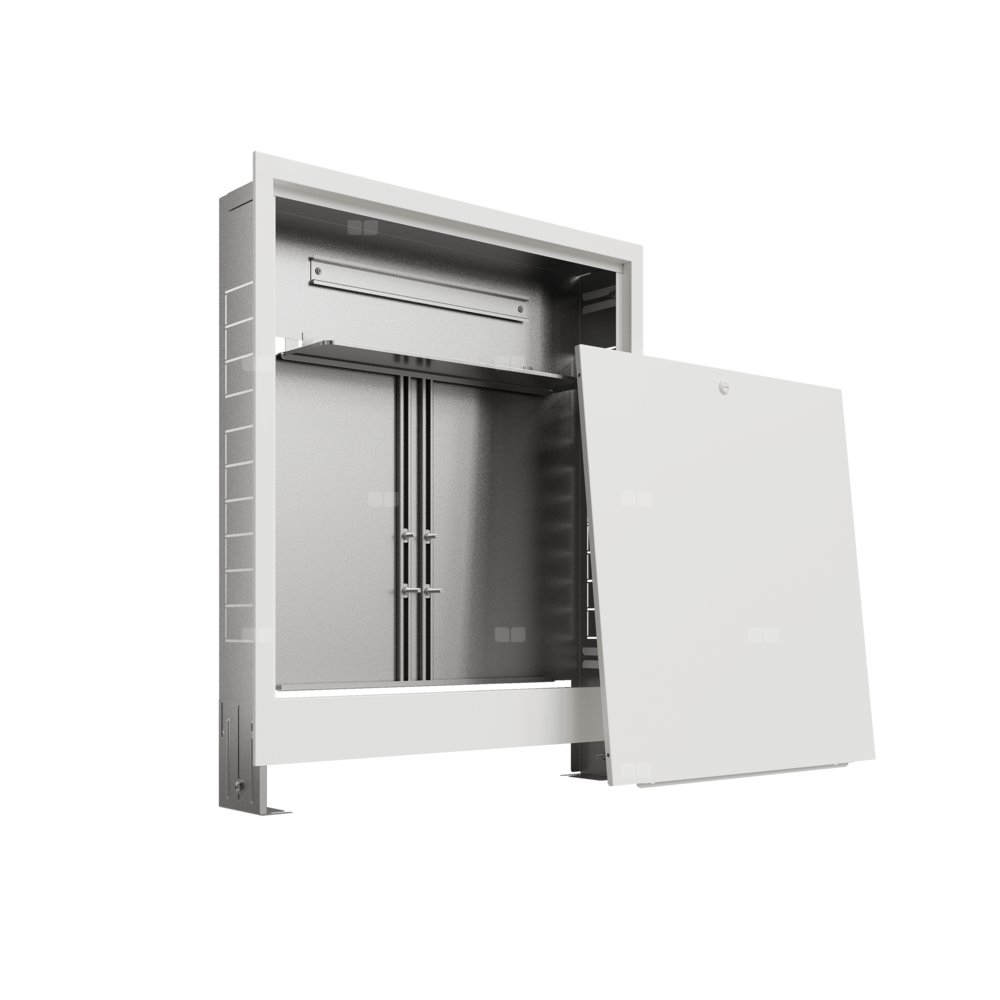 Szafki podtynkowe do rozdzielaczy ogrzewania podłogowego i grzejnikowego. Zastosowana ochrona antykorozyjna: płukanie chemiczne (odtłuszczanie), powłoka cyrkonowa, malowanie proszkowe farbą epoksydowo-poliestrową. Korpus szafki cynkowany wykonany z jednego arkusza blachy - łączony bez spawania. Ramka i drzwi szafki w całości malowane proszkowo. Łatwy, czysty montaż rozdzielacza. Ułatwiony szeroki dostęp do rozdzielacza podczas montażu. Mniejsze prawdopodobieństwo uszkodzenia ramki i drzwi szafki. Zamek na monetę. Szyny montażowe cynkowane z kompletem śrub i nakrętek ułatwiających montaż rozdzielacza.