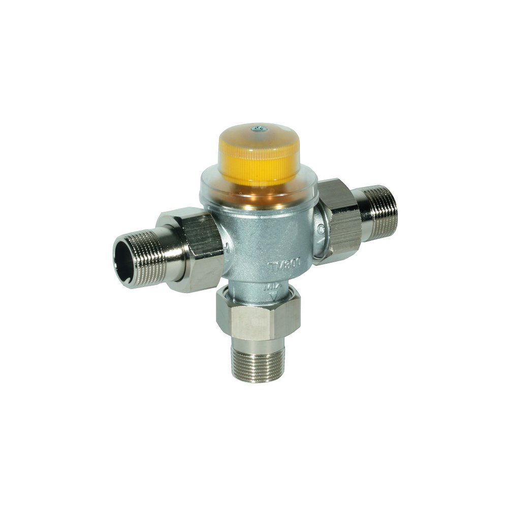 Termostatyczne zawory mieszające tego typu są stosowane do centralnej regulacji zasilania ciepłej wody użytkowej w systemach solarnych, w układach z dwoma źródłami energii. Bardzo czuły element termiczny umieszczony na wyjściu zaworu steruje trzpieniem regulującym proporcje przepływu gorącej i zimnej wody, tak by wymieszana woda miała temperaturę ustawioną za pomocą pokrętła nastawczego. Na wejściach zimnej i gorącej wody zastosowano "miękkie uszczelnienia" umożliwiające: