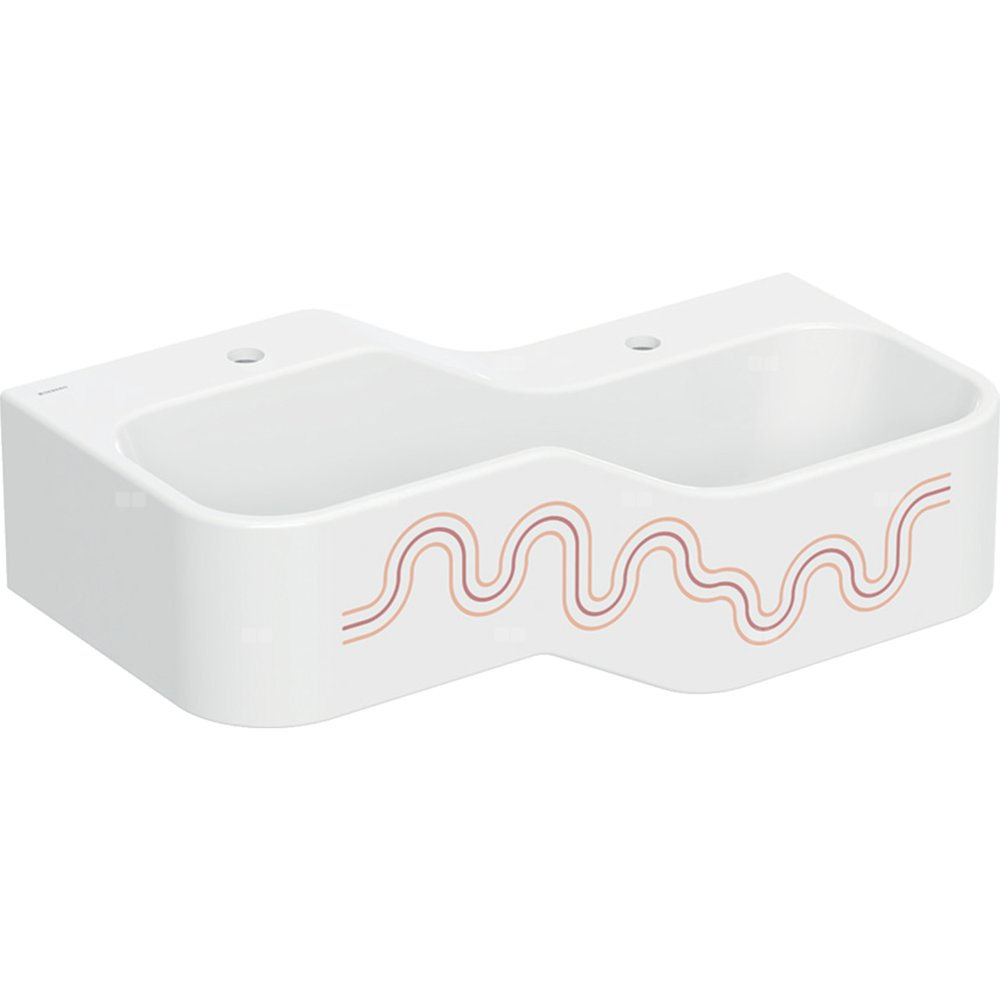 Umywalka GEBERIT Bambini 2-stanowiskowa prostokątna (rynna, elementy dekoracyjne), biała, 900mm, otwór na baterię na środku (x2), bez odpływu przelewowego, półka od ściany