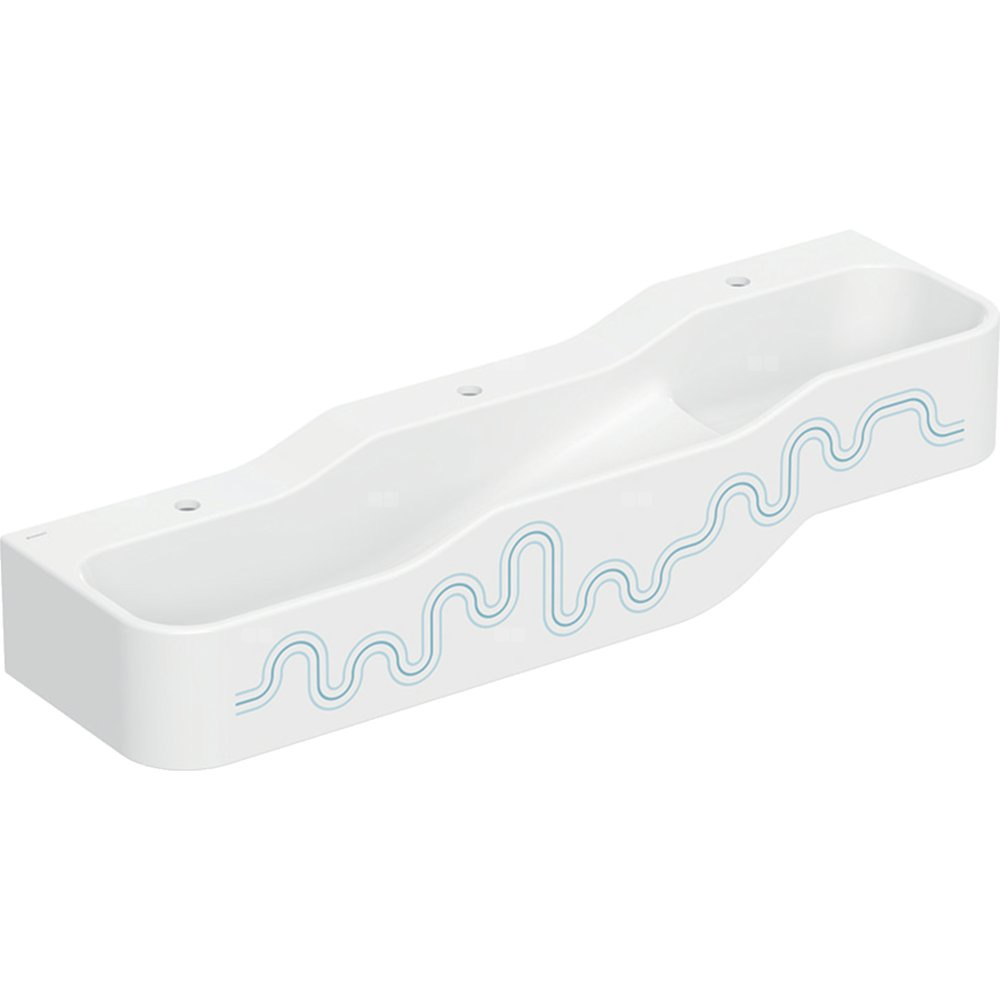 Umywalka GEBERIT Bambini 3-stanowiskowa prostokątna (rynna, elementy dekoracyjne), biała, 1400mm, otwór na baterię na środku (x3), bez odpływu przelewowego, półka od ściany