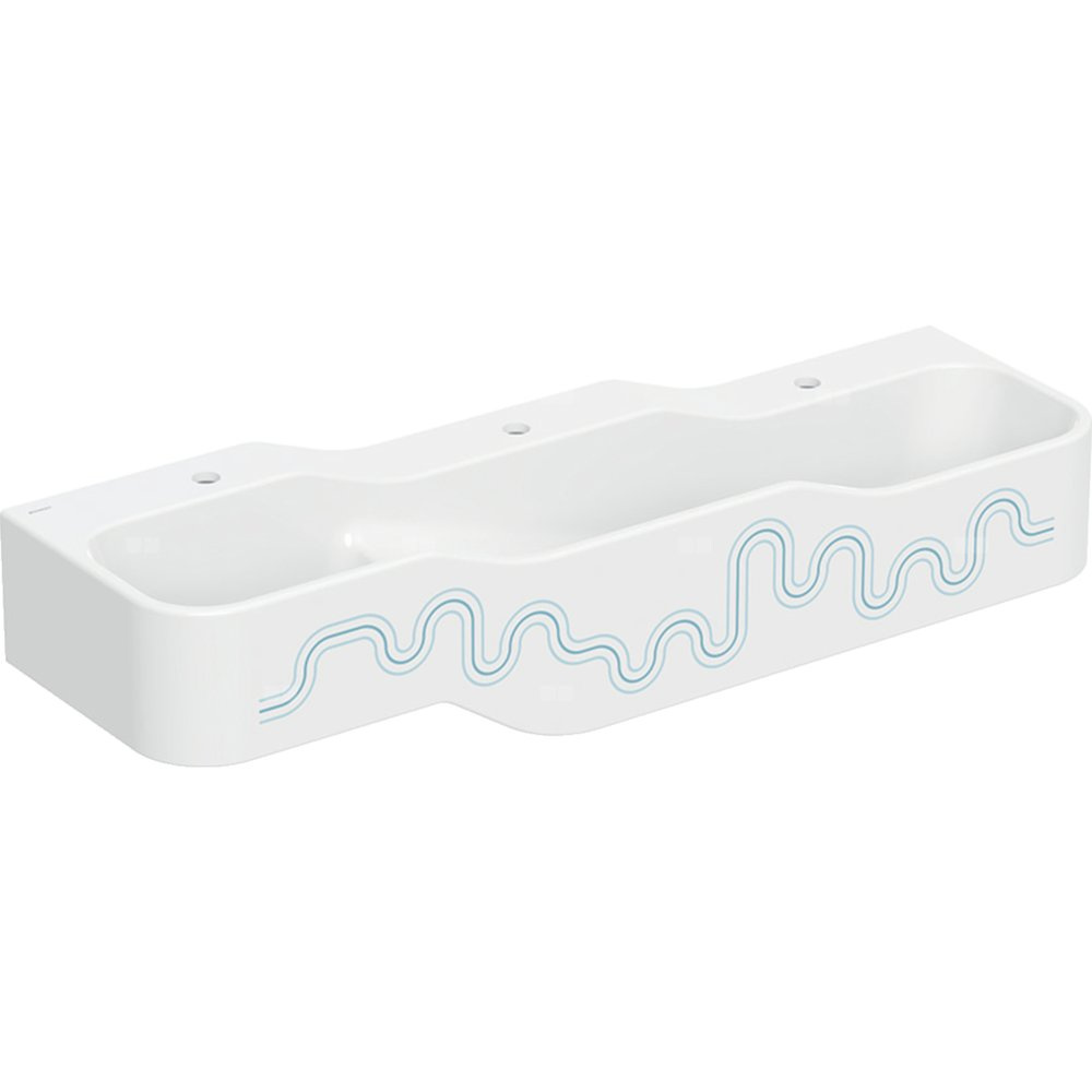 Umywalka GEBERIT Bambini 3-stanowiskowa prostokątna (rynna, elementy dekoracyjne), biała, 1400mm, otwór na baterię na środku (x3), bez odpływu przelewowego, półka od ściany
