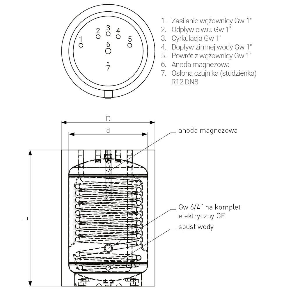 - Przyłącza wężownic, przyłącza ciepłej i zimnej wody - Gw 1", mufa cyrkulacyjna - Gw 1", osłona czujnika - 3/8", anoda magnezowa: 38x400 - korek 5/4" (górna dennica).