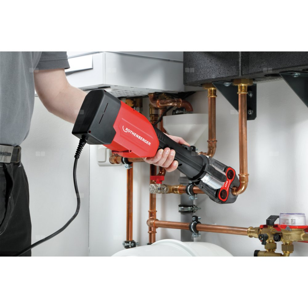Zaciskarka elektrohydrauliczna do zaprasowywania kształtek w zależności od sieci. To poręczne i lekkie narzędzie, idealne do seryjnej produkcji połączeń kształtek na placu budowy. ROMAX AC wykorzystuje technologię CFT, która gwarantuje stały nacisk osiowy 32-34 kn do 10 000 cykli prasy.